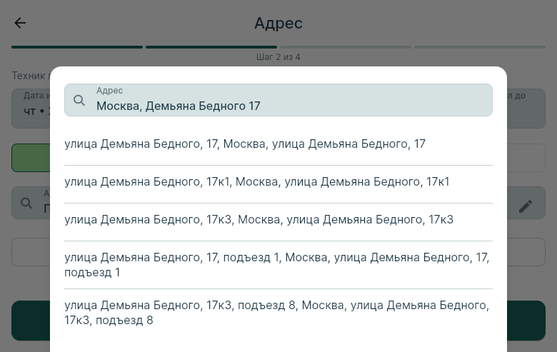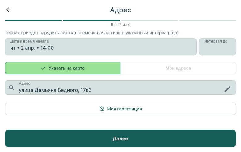 V1: PASS — Анонимный пользователь прошёл шаги 1-2 без логина. Дата/время выбраны через CupertinoPicker drag (завтра 14:00). Адрес "Москва, Демьяна Бедного 17 корпус 3" выбран из подсказок. Шаг 2 (карта) пройден успешно. |