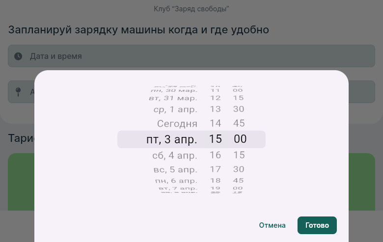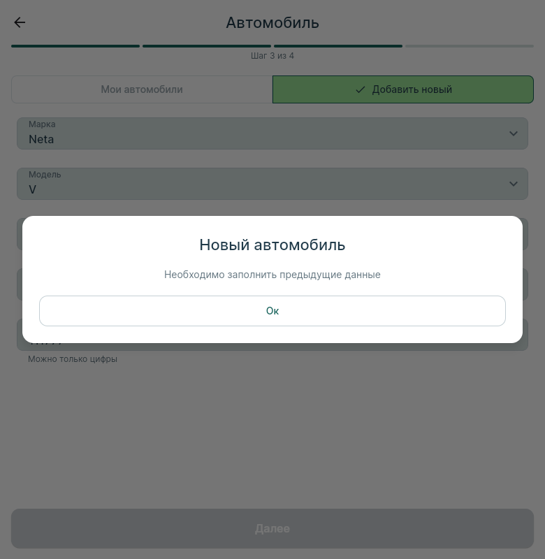 На Шаге 3 (Автомобиль), форма "Добавить новый": клик на поле "Марка" (и любое другое поле — Модель, Батарея, Коннектор) открывает диалог "Новый автомобиль — Необходимо заполнить предыдущие данные" вместо модального пикера брендов. Ошибка воспроизводится даже на свежей форме, когда все поля пустые и никаких "предыдущих данных" нет.