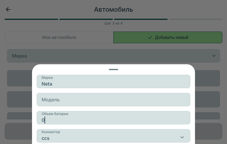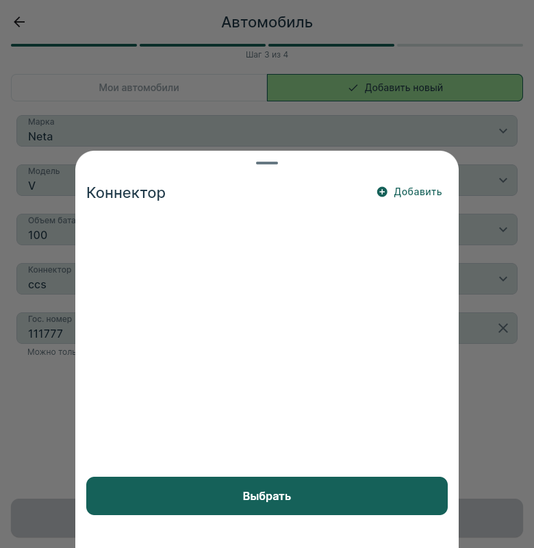 Диалог создания нового автомобиля (доступен через пикер Коннектора → "Добавить") корректно отображает все поля и активирует кнопку "Добавить" при заполнении. Однако после нажатия "Добавить" — диалог закрывается, форма сбрасывается в пустое состояние, автомобиль не появляется ни в форме, ни в табе "Мои автомобили", кнопка "Далее" остаётся недоступна.