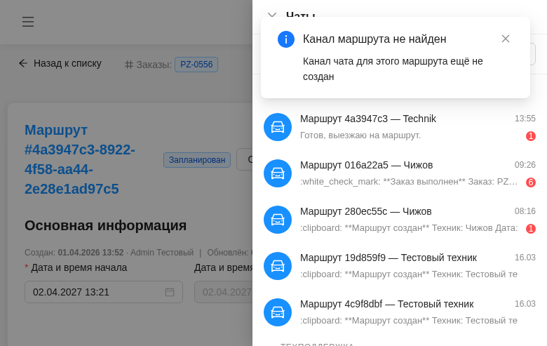 | ★ | Dispatcher | Доп. находка: «Канал маршрута не найден» на странице маршрута | BUG | 12s | Кнопка чата на странице маршрута 4a3947c3 показывает alert «Канал маршрута не найден / Канал чата для этого маршрута ещё не создан». НО: (1) в mm_channel_mapping корректная запись route_id→channel_id; (2) в ChatPanel канал «Маршрут 4a3947c3 — Technik» отображается корректно с сообщениями от 13:55. Dispatcher UI неправильно ищет канал со страницы маршрута. |